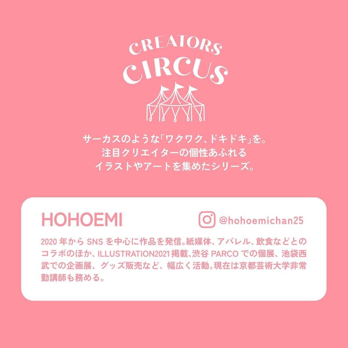 2020年からSNSを中心に作品を発信。紙媒体、アパレル、飲食などとのコラボのほか、ILLUSTRATION2021掲載、渋谷PARCOでの個展、池袋西武での企画展、グッズ販売など、幅広く活動。現在は京都芸術大学非常勤講師も務める。